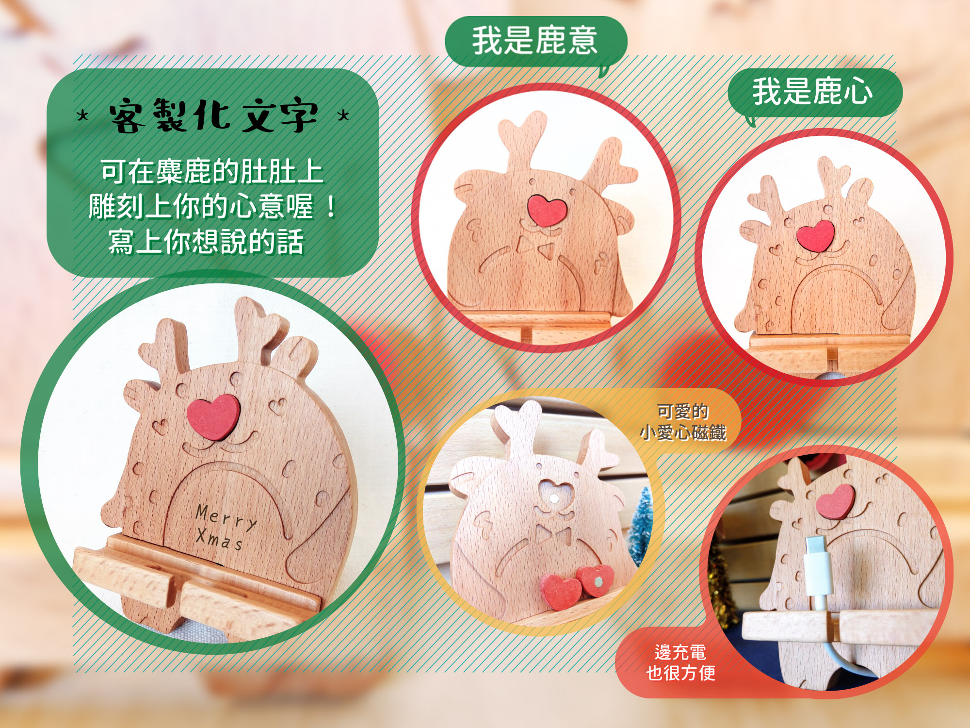 運用CNC雕刻技術,精細呈現這對麋鹿的可愛形象。麋鹿的愛心鼻子巧妙嵌入磁鐵,不僅吸引目光,還能固定小留言,讓手機座更具實用性。您還可以客製化雕刻文字,將祝福或名字刻在麋鹿肚子,超可愛!