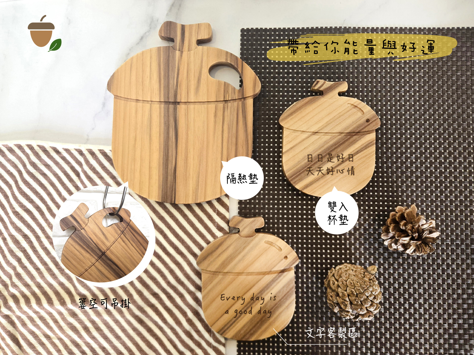 靈感來自森林果實,橡實象徵著成長、祝福與溫暖。這款橡實造型木製杯墊選用國產材台灣杉製成,紋理自然、色澤柔和,為每一份祝福增添質感。