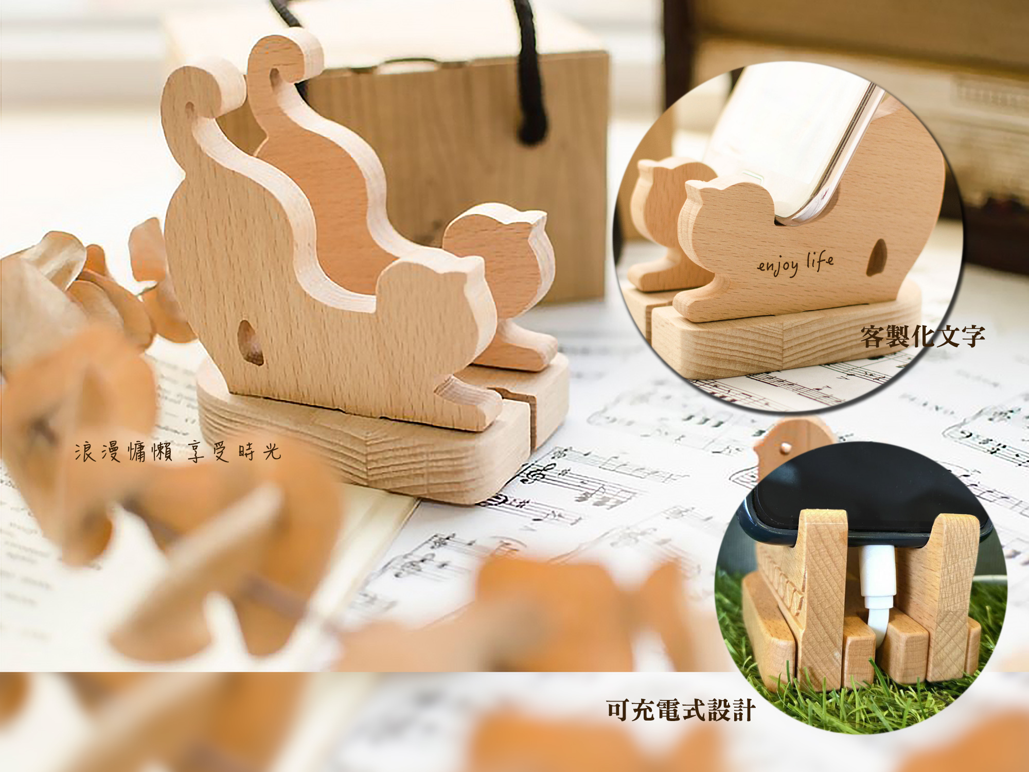 貓造型木頭手機架融合貓咪的優雅與慵懶,提供溫暖觸感,穩穩托住手機,提醒你放慢腳步。