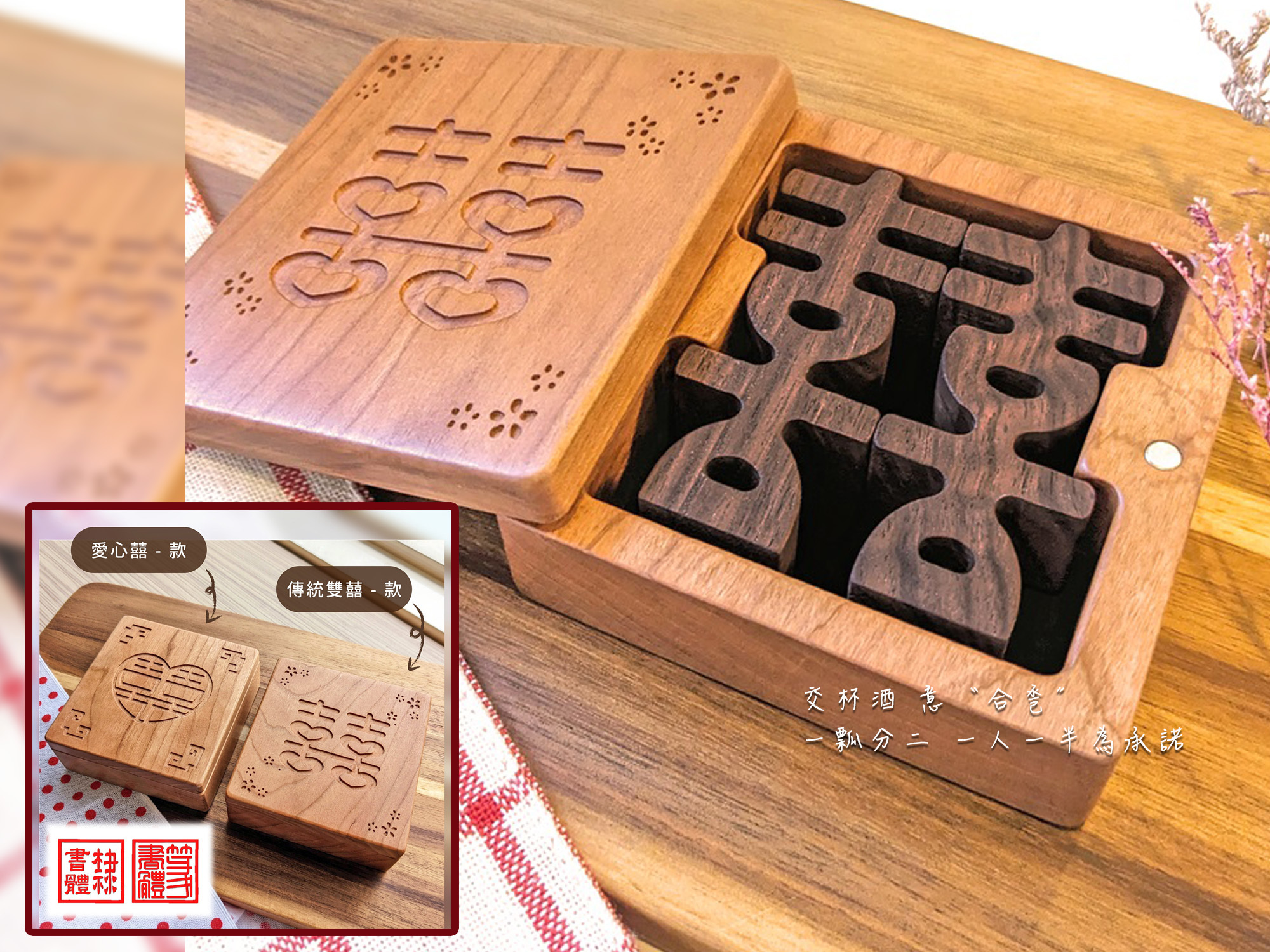 交杯酒 意〝合巹〞一瓢分為二一人一半,喝下即為承諾彼此結為夫妻 以交杯酒為意象結合雙喜,願新人永結同喜!幸福唷!