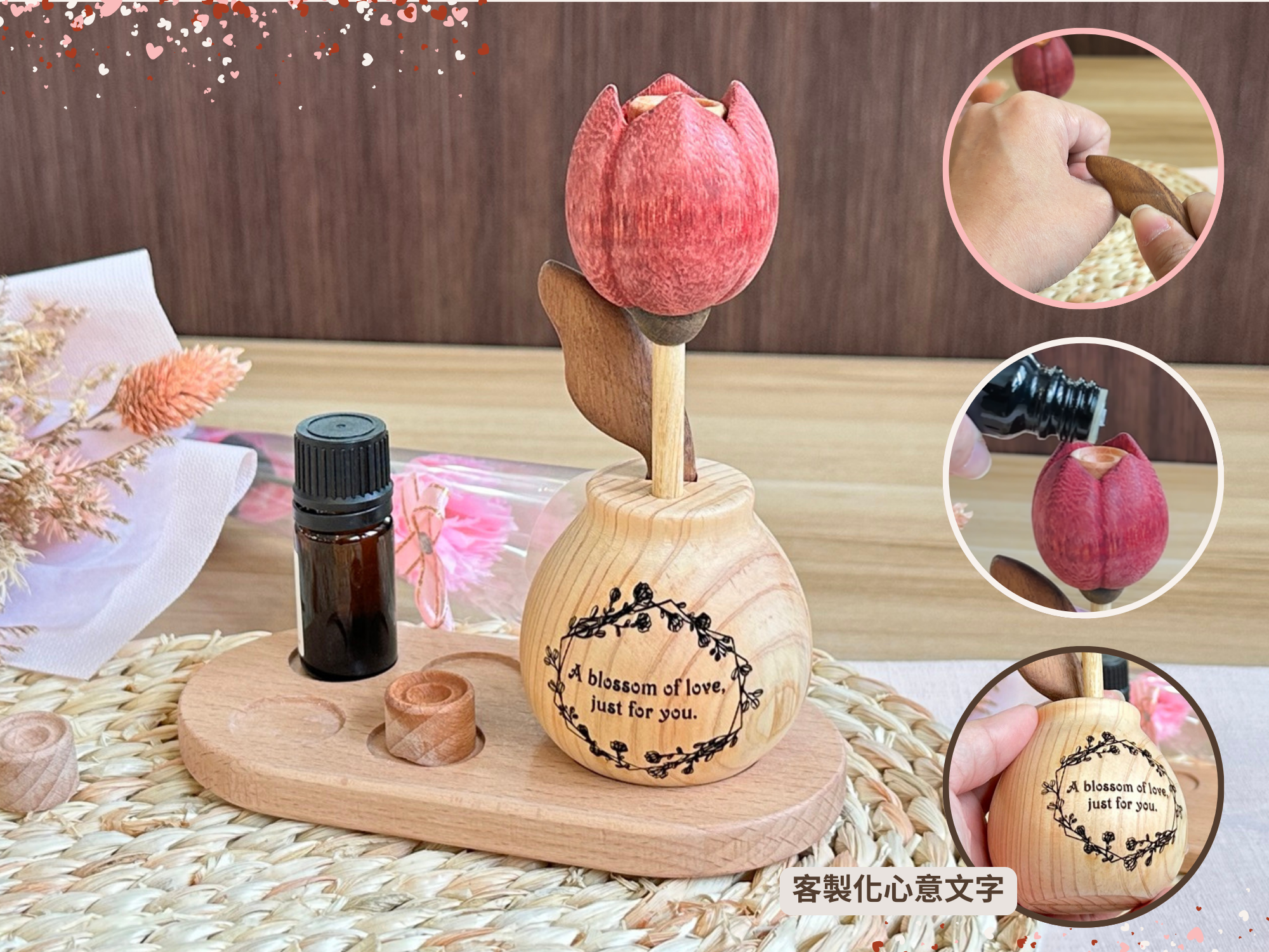 尋覓獨特又暖心的禮物?客製化鬱金香造型原木擴香指壓棒是您的理想選擇!