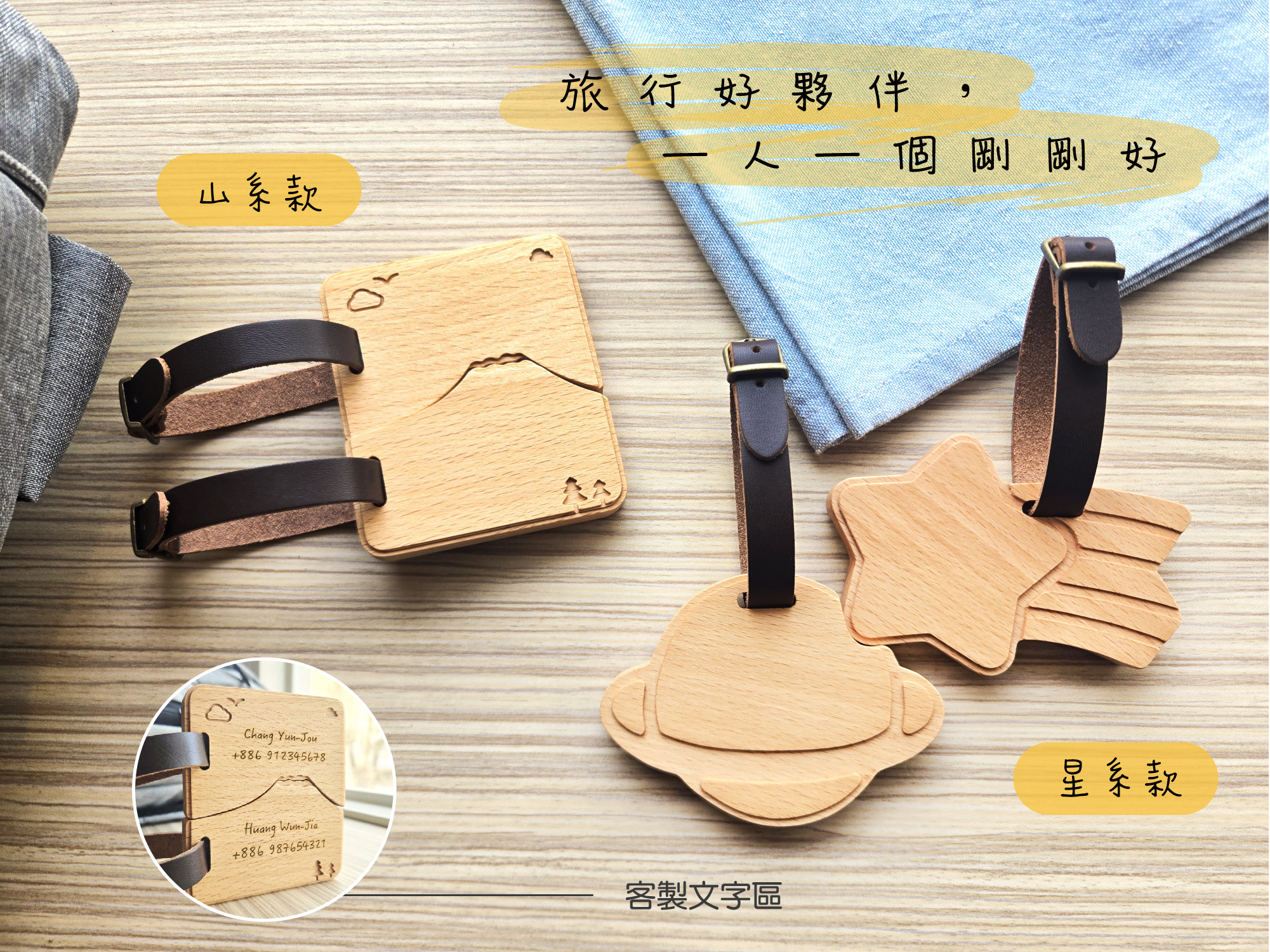 結合宇宙的浩瀚浪漫與山巒的沉穩依靠,打造出這對別具意義的木製行李吊牌。