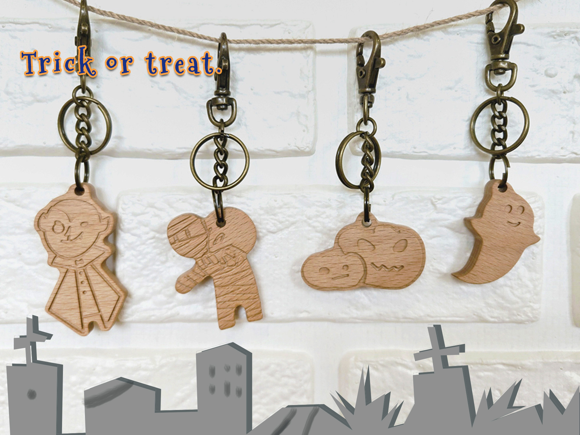 可愛木頭萬聖節主題鑰匙圈,細緻特色雕刻,客製化文字服務,充滿過節氛圍,