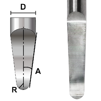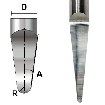 ◆球頭半徑(R) 0.5 mm ◆刀刃長度 15 mm ◆刀具全長 50 mm ◆刀柄直徑(D) 4 mm ◆刃數 1 ◆角度(A) 5.5