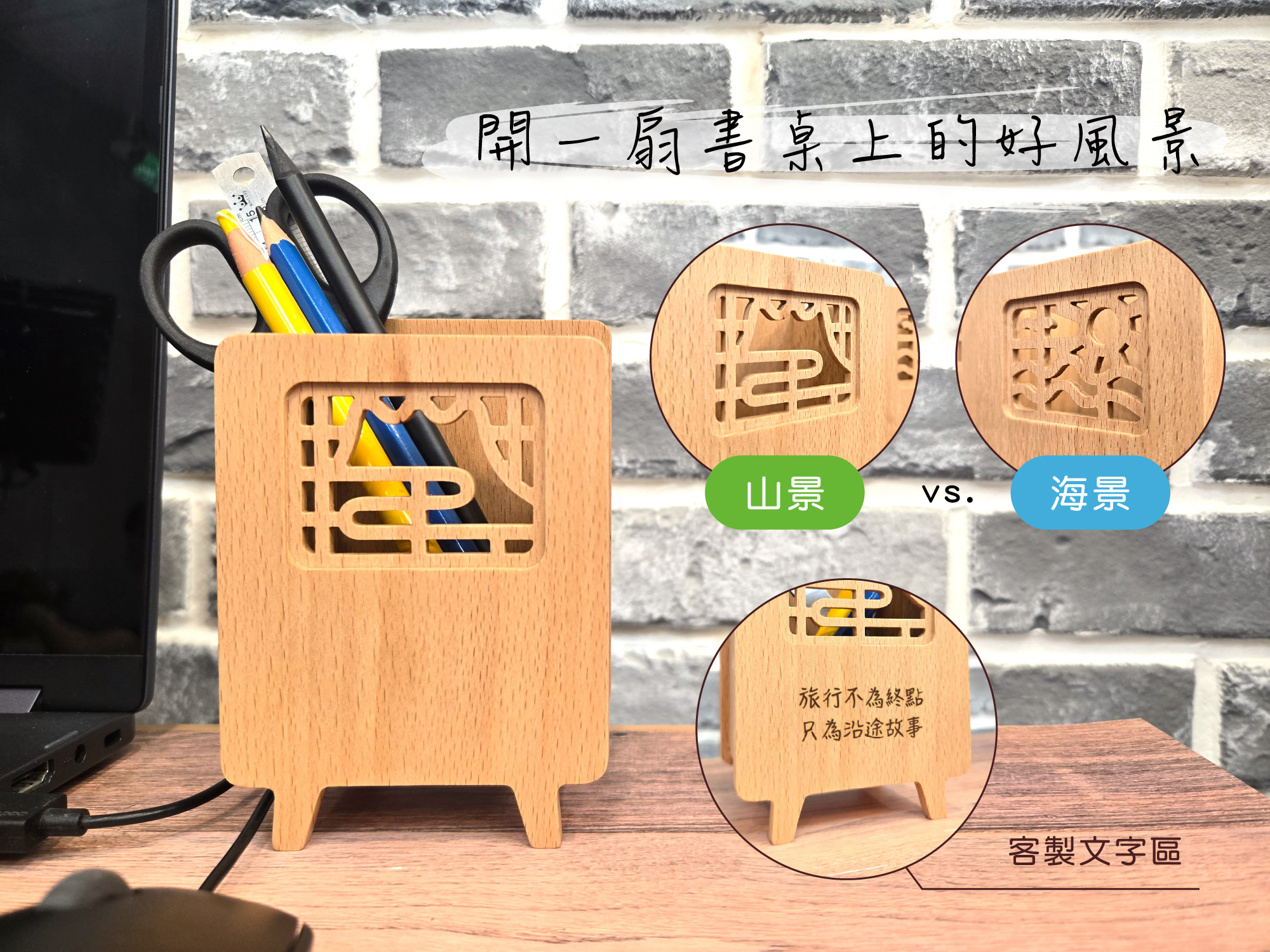 以CNC雕刻精緻呈現窗花簍空風景,這款木質筆筒為辦公桌注入一抹自然意境。